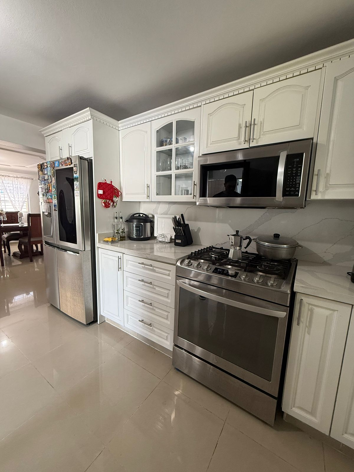 • Cocina en caoba con topes en cuarzo.